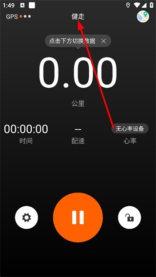 3、點擊GO按鈕后進入健走記錄界面,顯示當前距離時間配速等信息,界面中間設有暫停按鈕,操作該按鈕可控制健走記錄進程的暫停狀態。