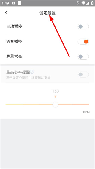 4、健走記錄界面找到設置入口進入健走設置,可調整自動暫停語音播報等功能開關,還能設置最高心率提醒的數值參數來適配需求。