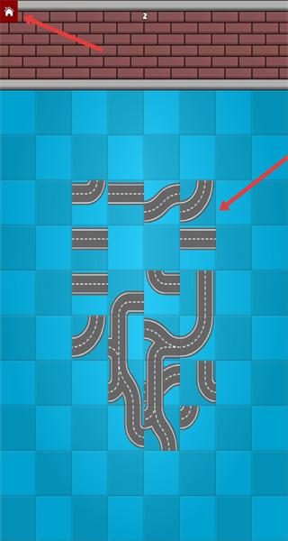 4、第二關背景為藍色,左上角有起點標識,拖動方格內道路片段規劃路線連接起點,確保路段連貫相通完成拼接挑戰通關。