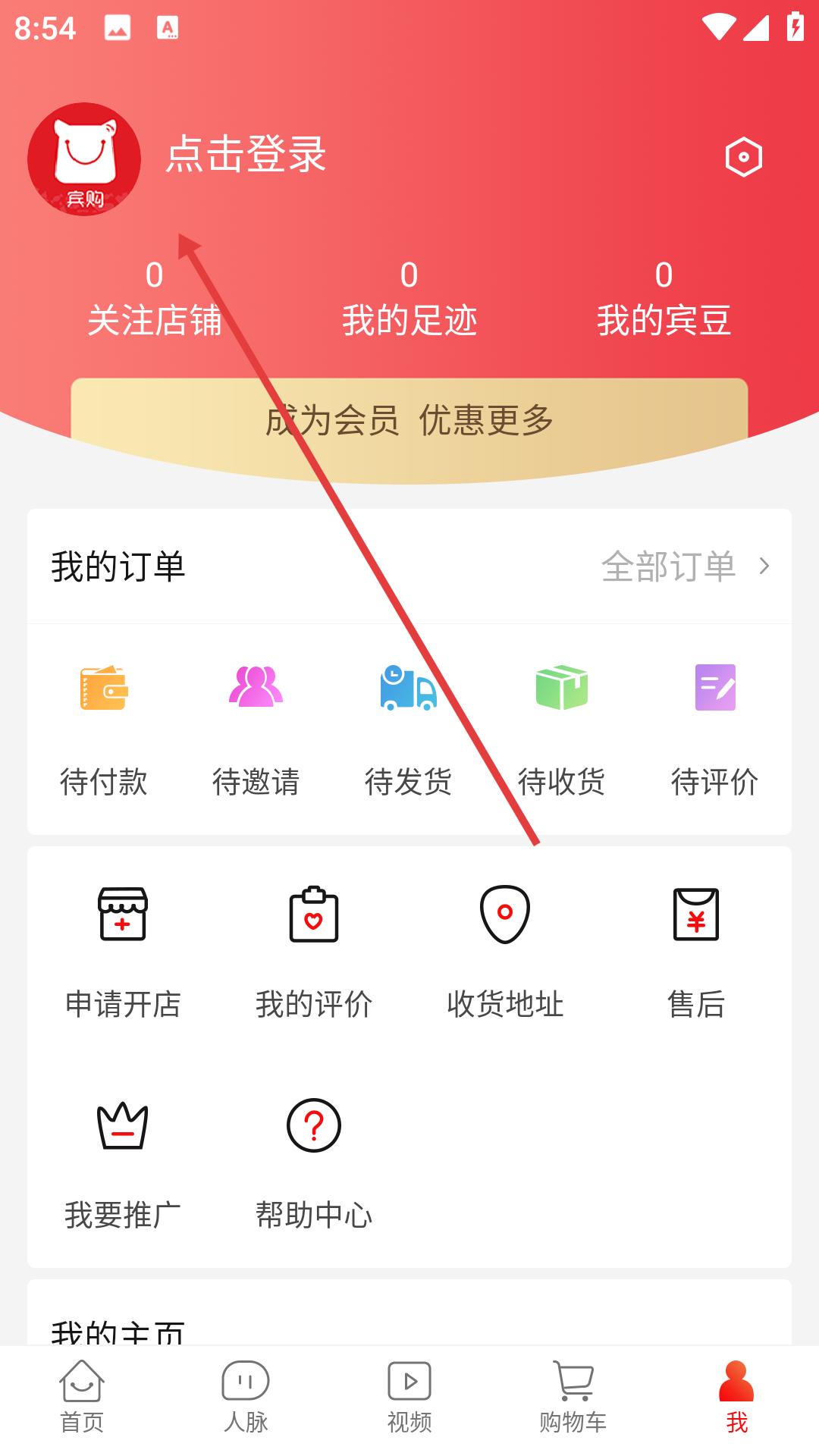 3、點我的,點登錄,管理訂單、關注店鋪,成為會員享優惠,使用評價、售后等功能,便捷購物。