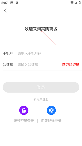 1、進入賓購商城的登錄界面,可選擇輸入手機號與驗證碼登錄,也能通過賬號密碼登錄、匯智能通登錄,新用戶可點擊新用戶注冊按鈕開啟注冊流程。