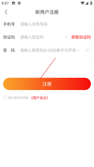 2、進入新用戶注冊頁面,輸入手機號獲取并填寫驗證碼,設置6-30位數字與字母組合的密碼,勾選已閱讀并同意用戶協議后點擊注冊完成賬號注冊。
