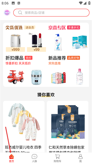 3、進入首頁,可通過搜索欄搜索商品或店鋪,瀏覽尖貨優選、京喜專區等板塊商品,還有折扣爆品、新品推薦分類及猜你喜歡的推薦內容。