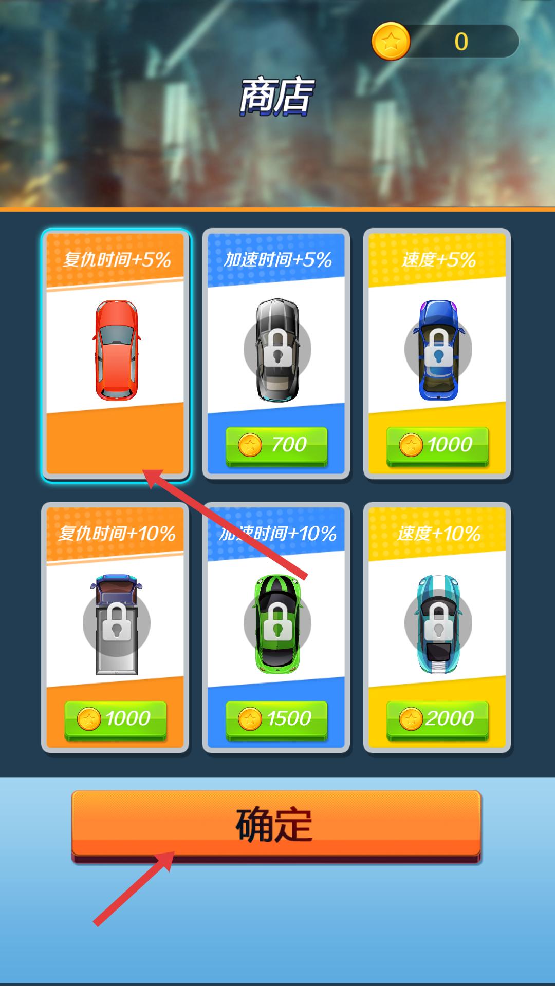 2、在商店界面,有不同屬性加成的賽車可供選擇,部分賽車需用金幣解鎖,選好賽車后點擊確定,就能使用該賽車進行游戲。