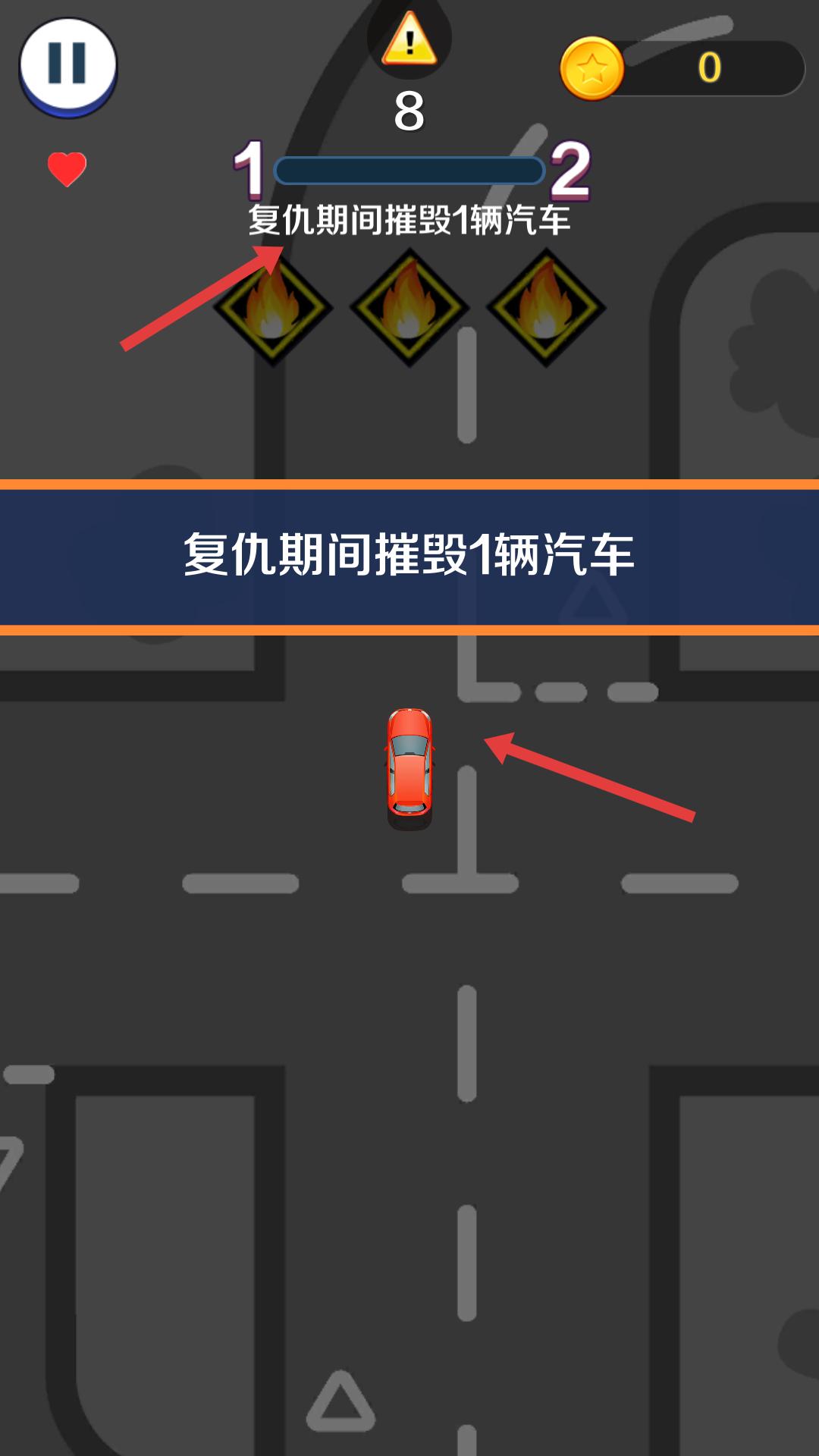 3、游戲過程中,會有復仇期間摧毀1輛汽車等任務提示,操控紅色賽車在道路上行駛,完成任務推進游戲。