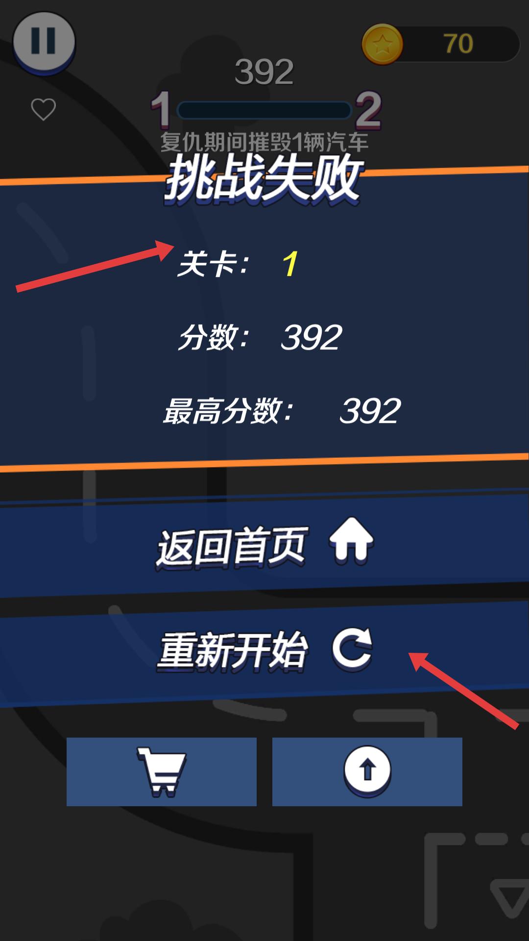 4、若挑戰失敗,會出現顯示關卡,分數,最高分數的界面,此時可選擇返回首頁或重新開始,再次嘗試挑戰關卡。
