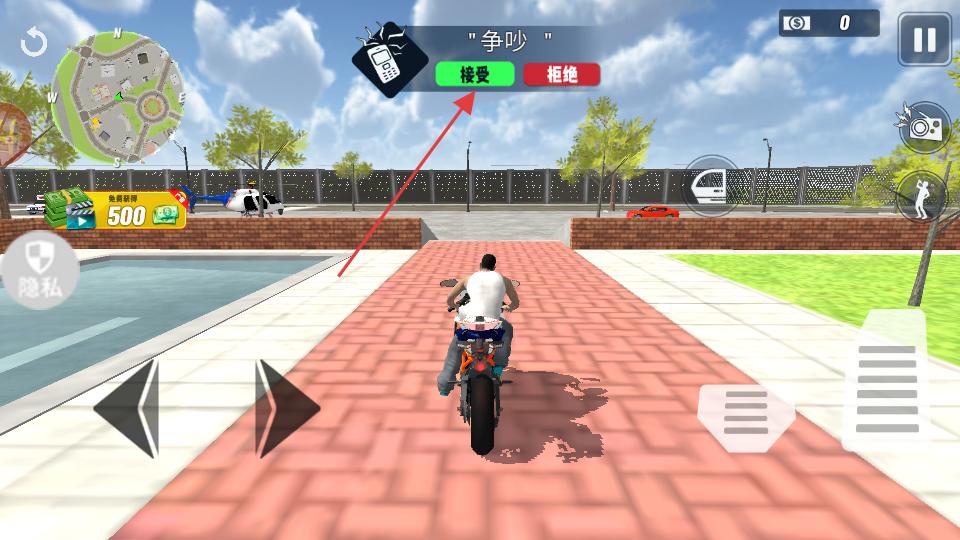 3、當角色駕駛摩托時,若上方出現任務提示彈窗,會有接受和拒絕兩個選項,根據游戲策略選擇其中一個選項,選擇后將觸發對應的任務線,推動冒險進程。