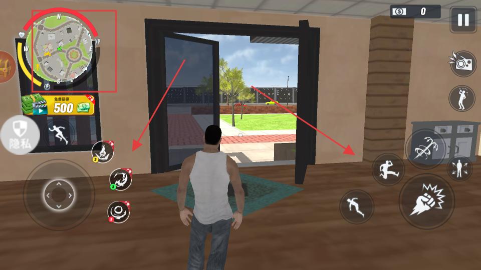 2、在室內場景中使用左側的虛擬搖桿控制角色移動方向,右側分布著各類動作按鍵,比如奔跑、攻擊等,根據場景需求點擊相應按鍵,探索室內區域。