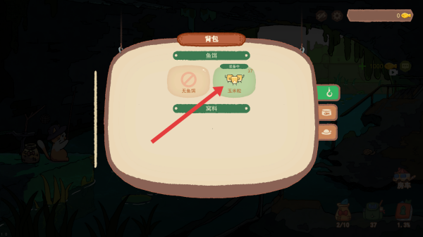 3、進入背包界面,可查看擁有的魚餌等物品,比如能看到玉米粒魚餌,為后續釣魚做準備。