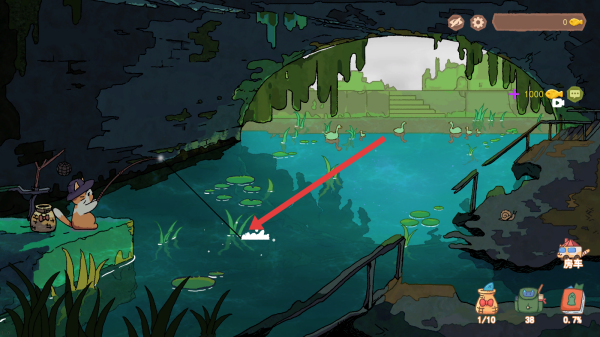1、進入游戲森林水域旁,操控小貓角色進行釣魚,等待魚上鉤,開啟釣魚體驗。