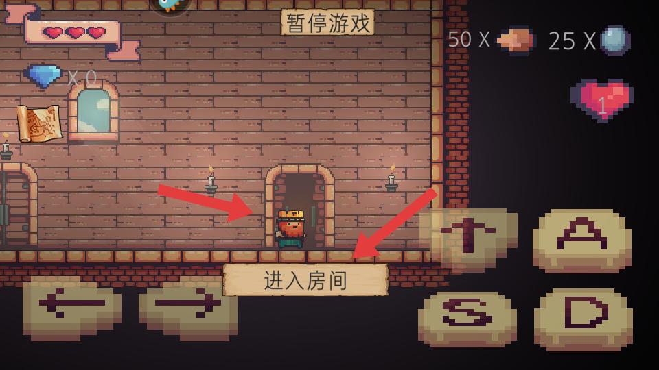2、游戲場景中操控國王角色移動,看到有進入房間的提示,點擊進入房間,去探索房間內的內容,推進冒險進程。