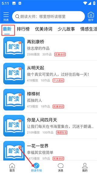 2、朗讀專輯,有最新等分類標簽,展示再別康橋等專輯,含播放量和作品數,方便選擇朗讀內容。