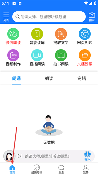 1、首頁,有微信朗讀等功能入口,底部有首頁等導航欄,當前朗誦板塊無數據,可輸入內容朗讀。