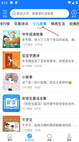 3、少兒故事分類,呈現中華成語故事等專輯,包含播放量與作品數,適合兒童聽讀學習相關內容。