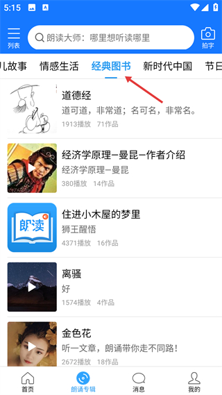 4、經典圖書分類,展示道德經等專輯,標注播放量和作品數,可收聽經典書籍的朗讀內容。
