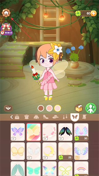4、完成裝扮后點擊返回按鈕回到游戲主場景,展示精心裝扮好的小花仙形象,還可以截圖保存自己滿意的裝扮成果。