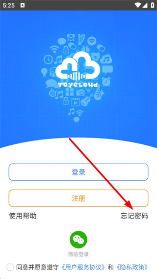 1、進入Toycloud初始界面,可見登錄、注冊等功能按鈕,點擊忘記密碼選項,進入密碼找回的相關操作頁面。