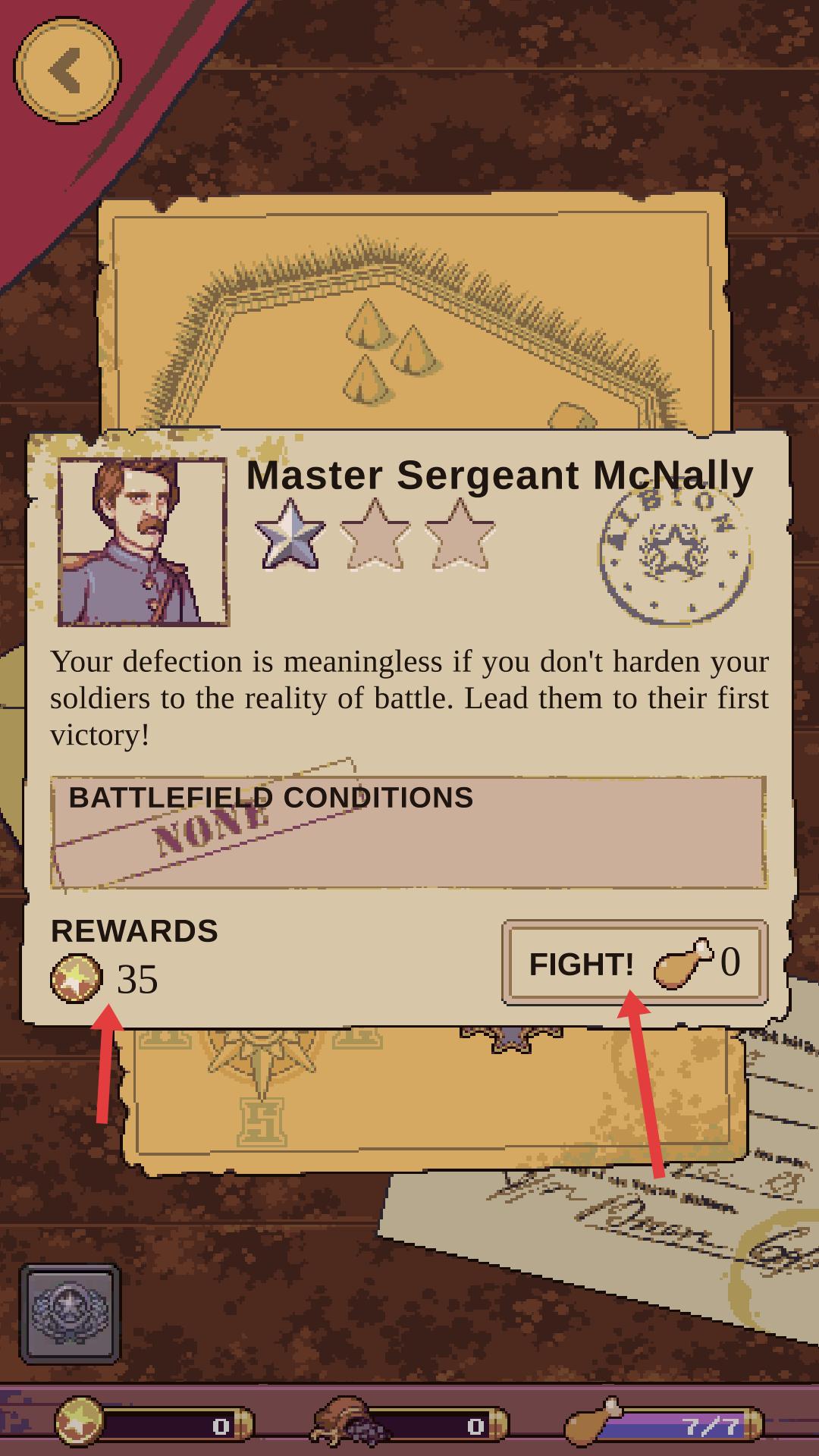 2、查看敵人McNally的信息,包括星級、戰場條件,獎勵為35星星,點擊FIGHT進入戰斗,戰斗前確認自身資源、兵力,合理分配,爭取勝利獲取獎勵。