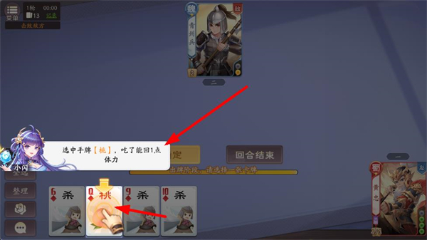 1、使用手牌桃,恢復自身1點體力,維持角色生存狀態,為后續對戰和技能釋放提供保障。
