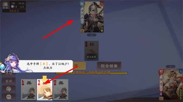 2、使用手牌殺,攻擊敵方青州兵,使其減少1點體力,消耗敵方戰力,推進對戰進程,爭取勝利。