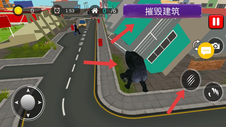 3、進入游戲場景,操控金剛在城市里行動,利用虛擬按鍵控制移動方向,還有攻擊等功能按鍵,執行摧毀建筑任務。