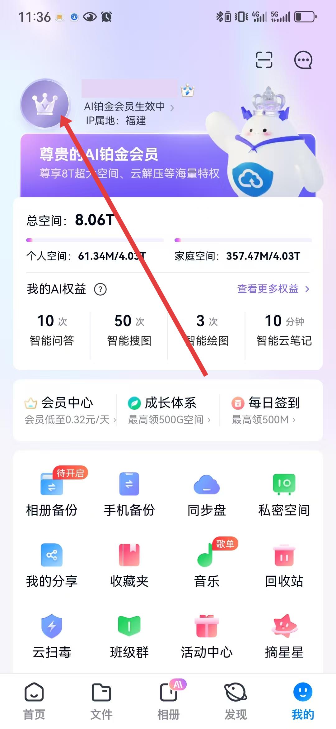 1、打開點擊底部導航欄的我的進入個人中心頁面,在該頁面上方能看到會員信息、空間使用情況等內容,找到并點擊代表會員標識的頭像區域,進入賬號相關設置界面。