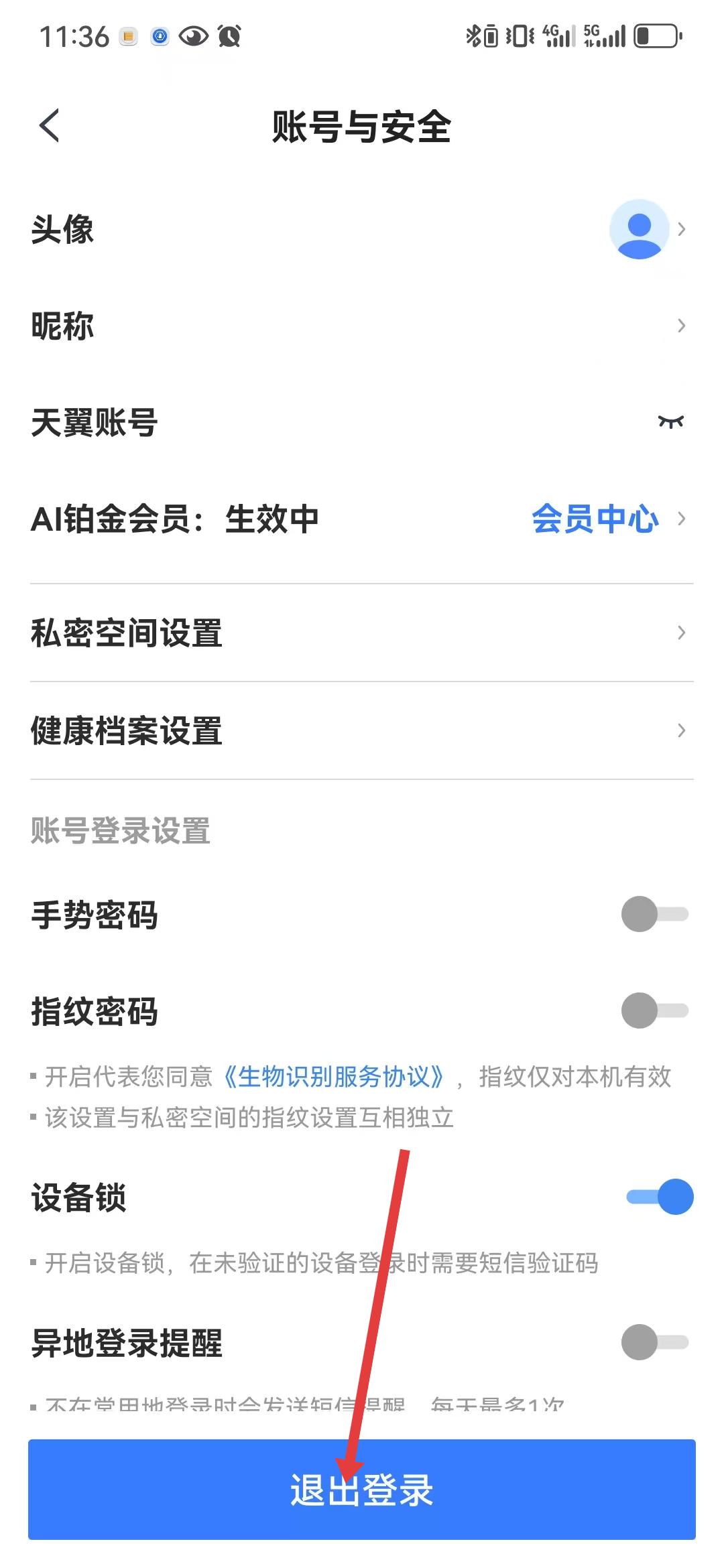 2、進入賬號與安全頁面找到退出登錄按鈕,該頁面還可設置頭像、昵稱,管理會員信息以及進行私密空間、健康檔案等設置,按需操作后點擊退出登錄按鈕。