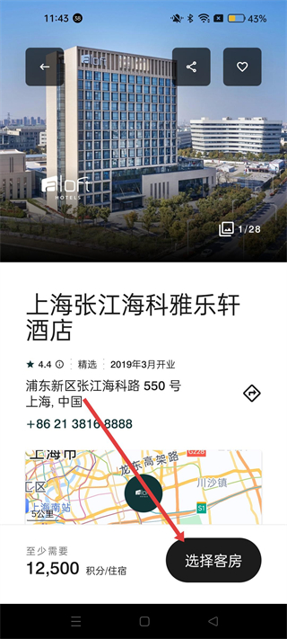 3、查看酒店詳情時,可了解酒店的評分、開業時間、地址和聯系方式,點擊選擇客房進入客房預訂界面。