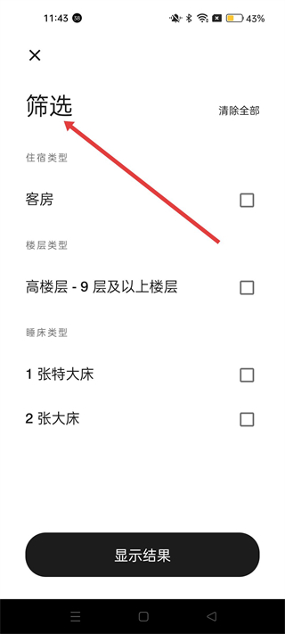 1、進入篩選界面,可選擇住宿類型、樓層類型、睡床類型等篩選條件,點擊顯示結果查看符合條件的酒店。