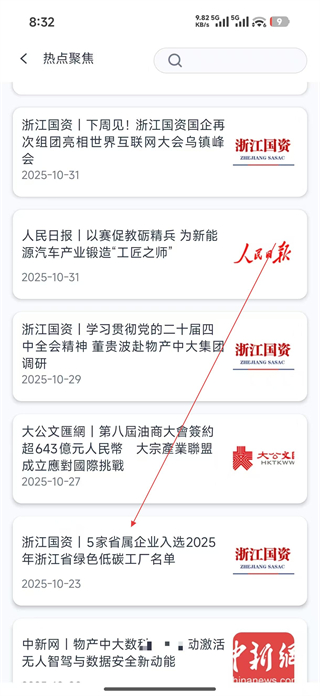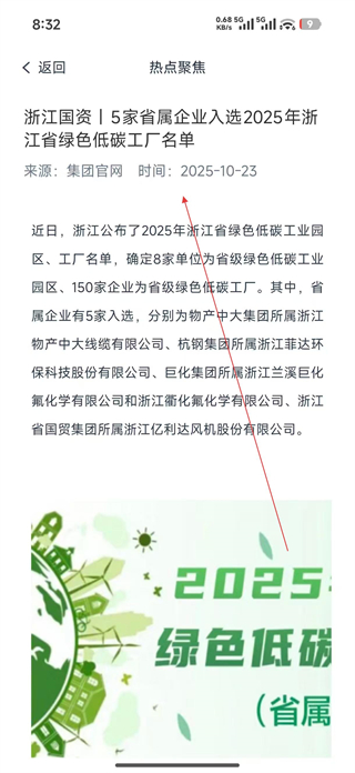 3、在熱點聚焦頁面選擇目標資訊條目,比如5家省屬企業入選綠色低碳工廠名單,點擊進入該資訊的詳情頁面。