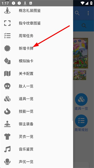 3、側邊欄中能找到新增卡牌入口,點擊可查看新增的卡牌信息,此外還有模擬抽卡、關卡配置等功能選項。