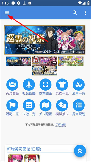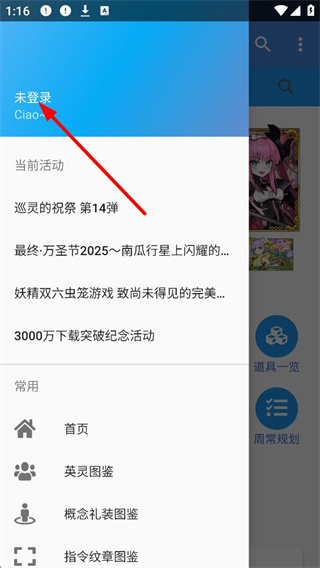 2、展開的側邊欄顯示未登錄狀態,列出當前活動如巡靈的祝祭第14彈等,還有首頁、英靈圖鑒等常用功能入口,可按需點擊進入。