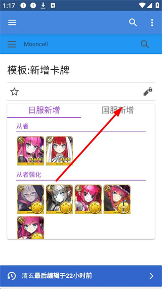 4、進入新增卡牌界面,有日服新增和國服新增兩個標簽,可查看日服新增的從者及從者強化等卡牌信息,了解游戲新卡牌動態。