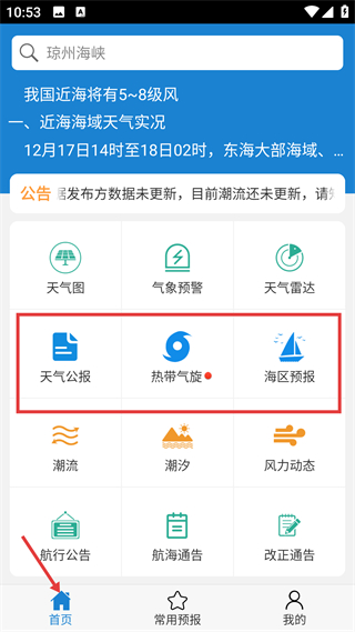 2、成功進入游戲首頁后,可通過頂部搜索欄輸入目標區域,界面設天氣圖氣象預警等功能入口,其中天氣公報熱帶氣旋海區預報被標注,底部有首頁等導航欄輔助操作。
