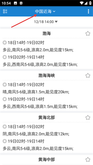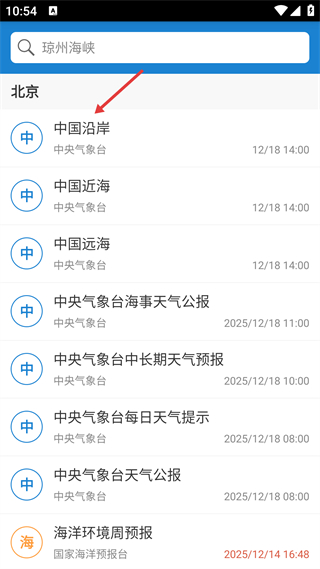 3、在搜索后的界面能看到不同區域的氣象預報列表,包含中國沿岸中國近海等選項,這些預報均由中央氣象臺提供,每個選項旁標注了對應的更新時間便于選擇查看。