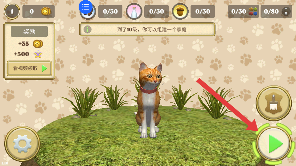 1、進入游戲,看到貓咪角色和獎勵提示,點擊綠色三角按鈕,開啟貓咪在游戲場景的冒險,準備完成各種任務。