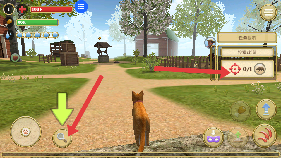 2、操控貓咪在莊園場景移動,任務提示需狩獵老鼠,點擊放大鏡按鈕,可查看周圍環境,尋找老鼠的蹤跡。