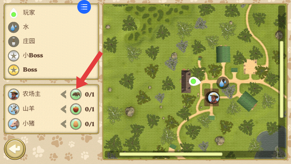 3、打開地圖界面,能看到玩家、水、莊園等標識,還有農場主、山羊、小豬等目標,根據地圖指引前往目標區域。