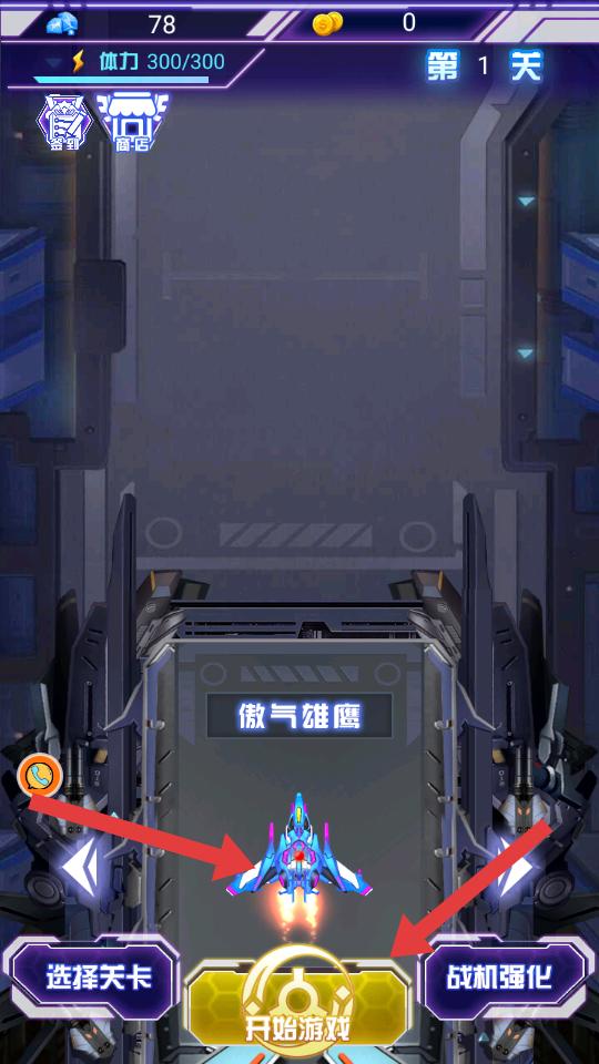 1、進入游戲,看到傲氣雄鷹戰機,有選擇關卡,開始游戲,戰機強化等選項,點擊開始游戲,進入關卡選擇界面,準備選關挑戰。