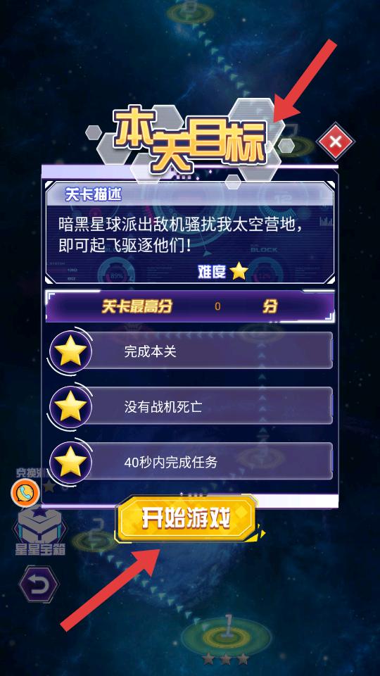 3、在當天目標界面,了解到要驅逐暗黑星球敵機,點擊開始游戲,進入戰斗場景,操控戰機在太空與敵機作戰。