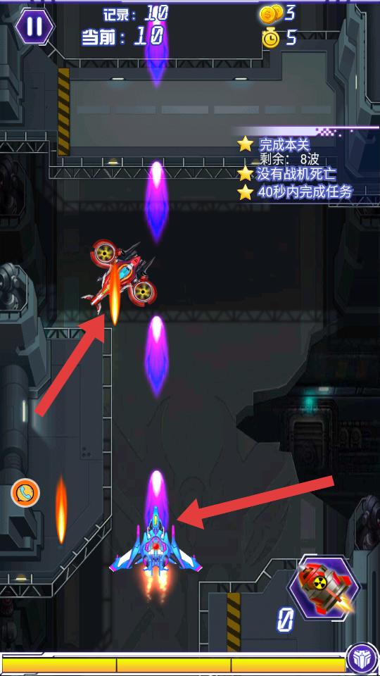 4、進入戰斗場景,操控戰機躲避敵機攻擊,同時發射炮彈打擊敵機,要在規定時間內且保證戰機不死亡,完成關卡任務。