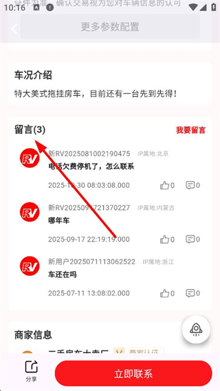 4、車輛詳情頁的留言區,可查看其他用戶的咨詢內容,也能點擊我要留言發布自己的疑問,獲取更多車輛相關信息。