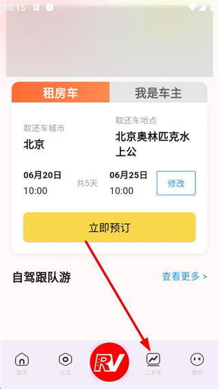 1、首頁選擇租房車板塊,可設置取還車城市、地點及時間,確認信息后點擊立即預訂,即可發起房車租賃申請。