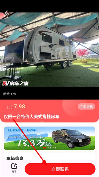 3、進入心儀二手房車的詳情頁,可查看車輛圖片、價格等信息,點擊立即聯系按鈕,能直接對接相關方咨詢購車事宜。