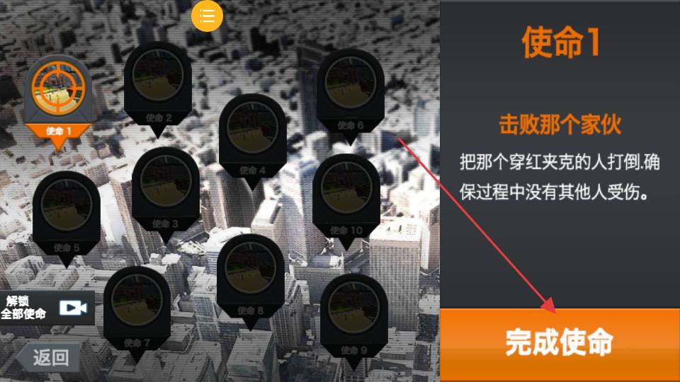 2、在任務選擇界面選擇標有使命1的任務,查看任務要求是擊敗穿紅夾克的人且不傷及他人,然后點擊完成使命按鈕,進入狙擊場景。