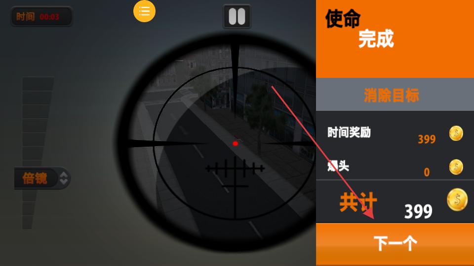 4、成功擊敗目標后會顯示使命完成的界面,界面會展示時間獎勵、爆頭數等信息,此時點擊下一個按鈕,可進入下一個狙擊任務,繼續挑戰。