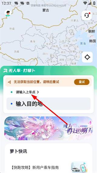 1、進入平臺,可輸入上車點和目的地,若無法獲取當前位置可點擊重試,查看蘿卜快訊了解新用戶乘車指南,開啟無人車叫車服務。
