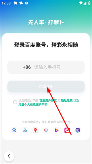 3、若未注冊百度賬號,可輸入手機號點擊立即注冊,注冊后即可登錄所有百度產品,享受無人車服務。