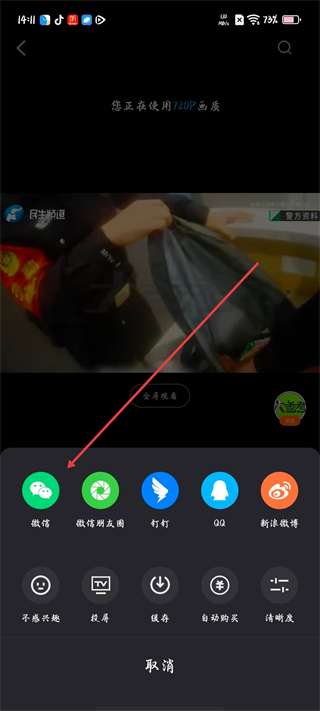 3、在分享頁面可選擇微信、微信朋友圈、釘釘等分享渠道,將視頻分享給好友,也可選擇不感興趣。
