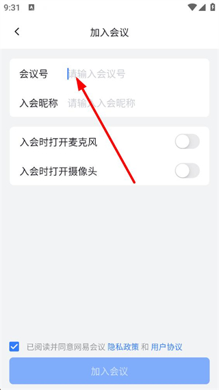 2、點擊加入會議后進入對應界面,需填寫會議號和入會昵稱,還能設置入會時打開麥克風和攝像頭的開關狀態,完成后可操作加入會議。